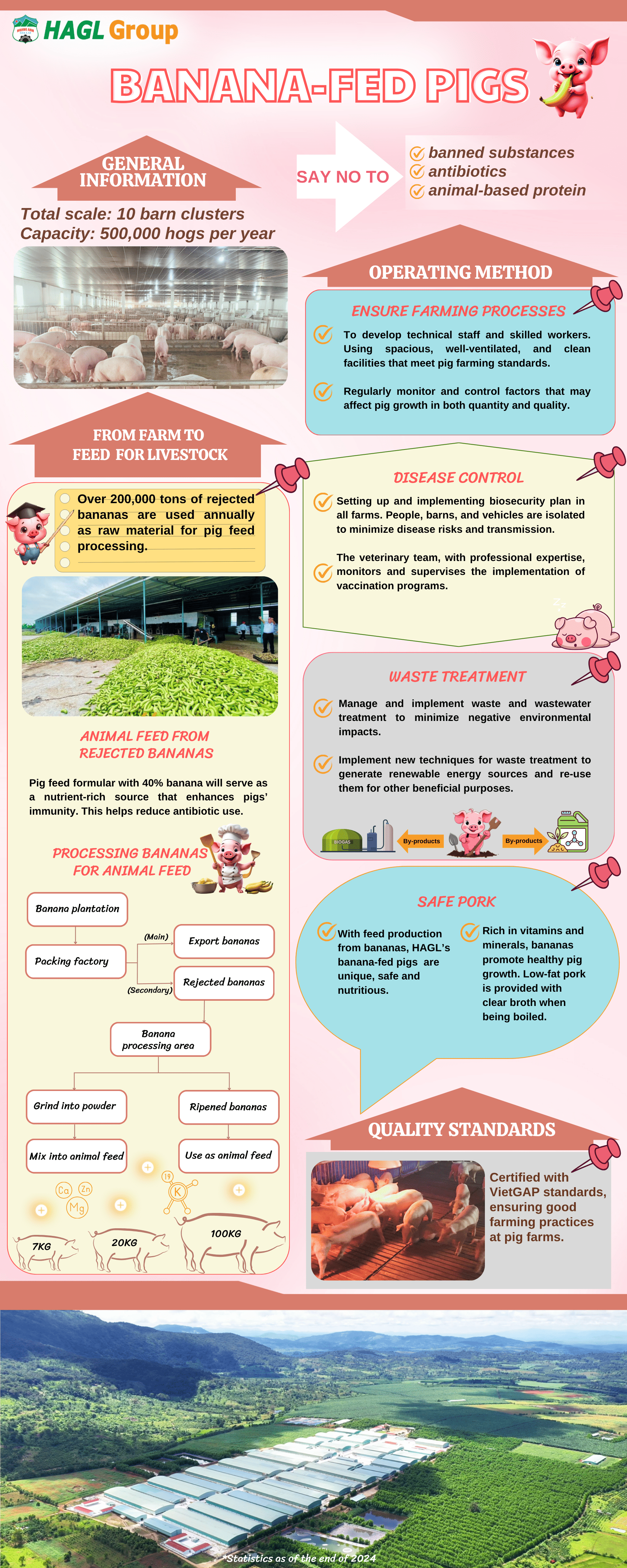 HAGL pigs are raised in a closed process with bananas grown for export as their primary food source, adhering to the "three no's" standard: no antibiotics, no banned substances, and no animal-based protein. Natural herbs are used in place of antibiotics, promoting warmth, digestive health, and appetite, ensuring full nutrient absorption, and enhancing the pigs' natural resistance to diseases. Plant-based proteins such as soybeans and corn, supplemented with imported micronutrients, replace animal protein. To protect consumer health, HAGL pig feed is free from weight gain substances preferring instead safe plant-based materials. Lean tending cross-bred pig yields ample leaned pork.