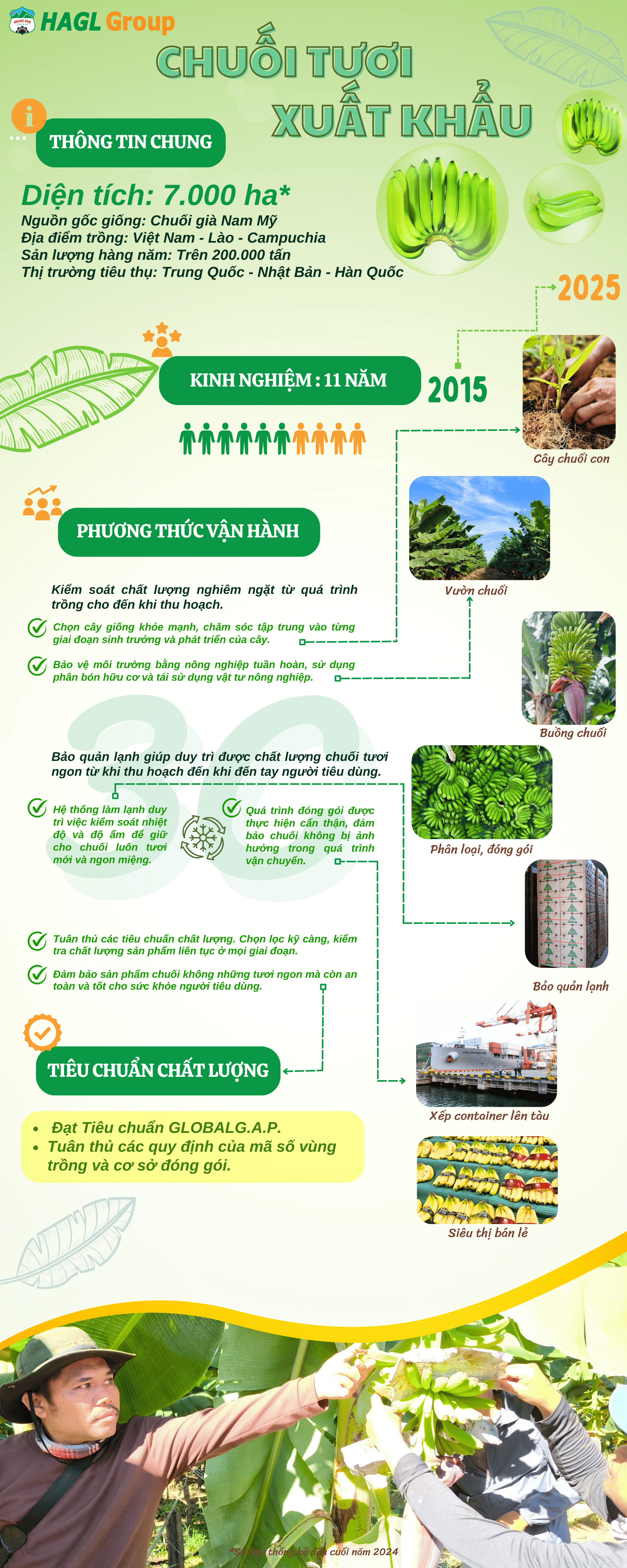 Sản phẩm chuối của HAGL là sản phẩm an toàn, chất lượng cao, đạt chuẩn GLOBALG.A.P và tuân thủ triệt để các quy định của mã số vùng trồng và cơ sở đóng gói. Chuối được bảo quản lạnh giúp duy trì được chất lượng tươi ngon từ khi thu hoạch đến khi đến tay người tiêu dùng. Quá trình đóng gói được thực hiện cẩn thận, đảm bảo chuối không bị ảnh hưởng trong quá trình vận chuyển. Chúng tôi cam kết truy xuất nguồn gốc xuất xứ một cách rõ ràng và minh bạch. Khi phát sinh các vấn đề chất lượng sau bán hàng, HAGL sẵn sàng phối hợp với khách hàng để xử lý nhanh chóng.