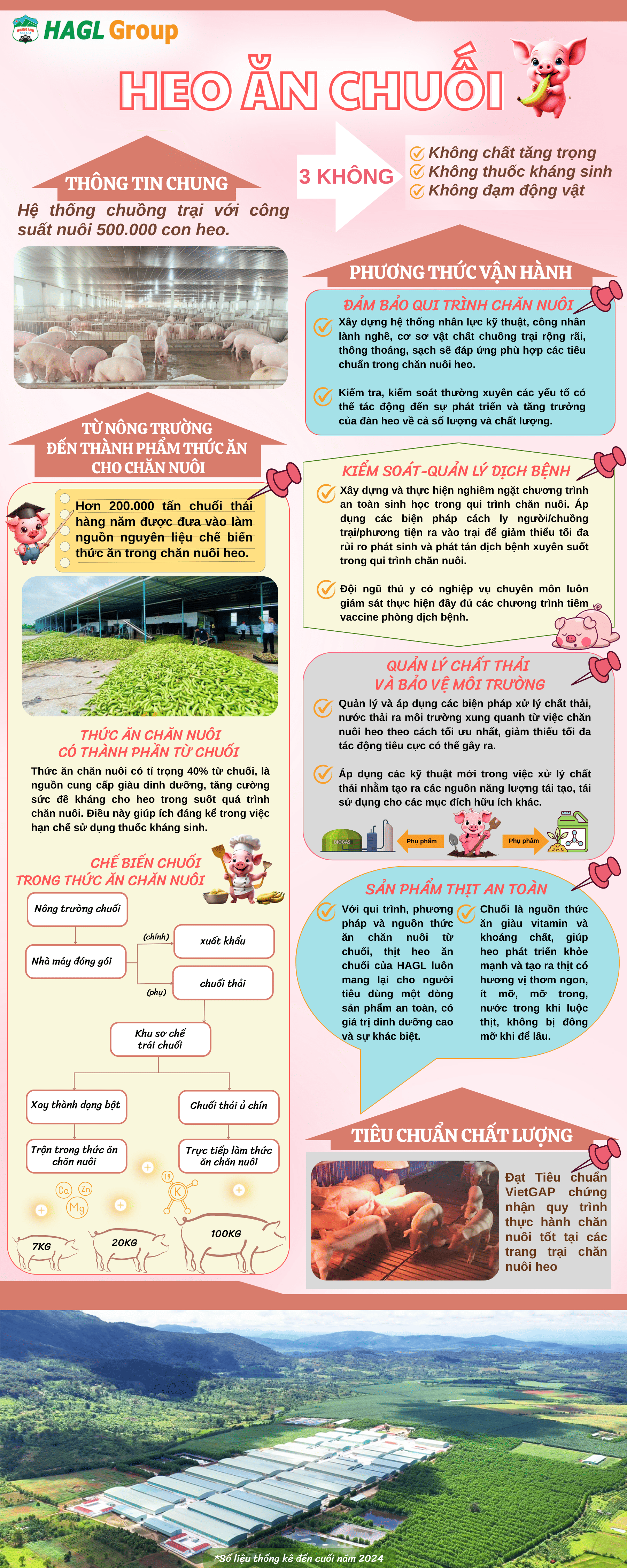 Sản phẩm heo ăn chuối của HAGL là sản phẩm an toàn, chất lượng cao, đạt chuẩn VIETG.A.P và tuân thủ triệt để quy trình thực hành chăn nuôi tốt tại các trang trại chăn nuôi heo. Chúng tôi cam kết truy xuất nguồn gốc xuất xứ một cách rõ ràng và minh bạch. Khi phát sinh các vấn đề chất lượng sau bán hàng, HAGL sẵn sàng phối hợp với khách hàng để xử lý nhanh chóng.